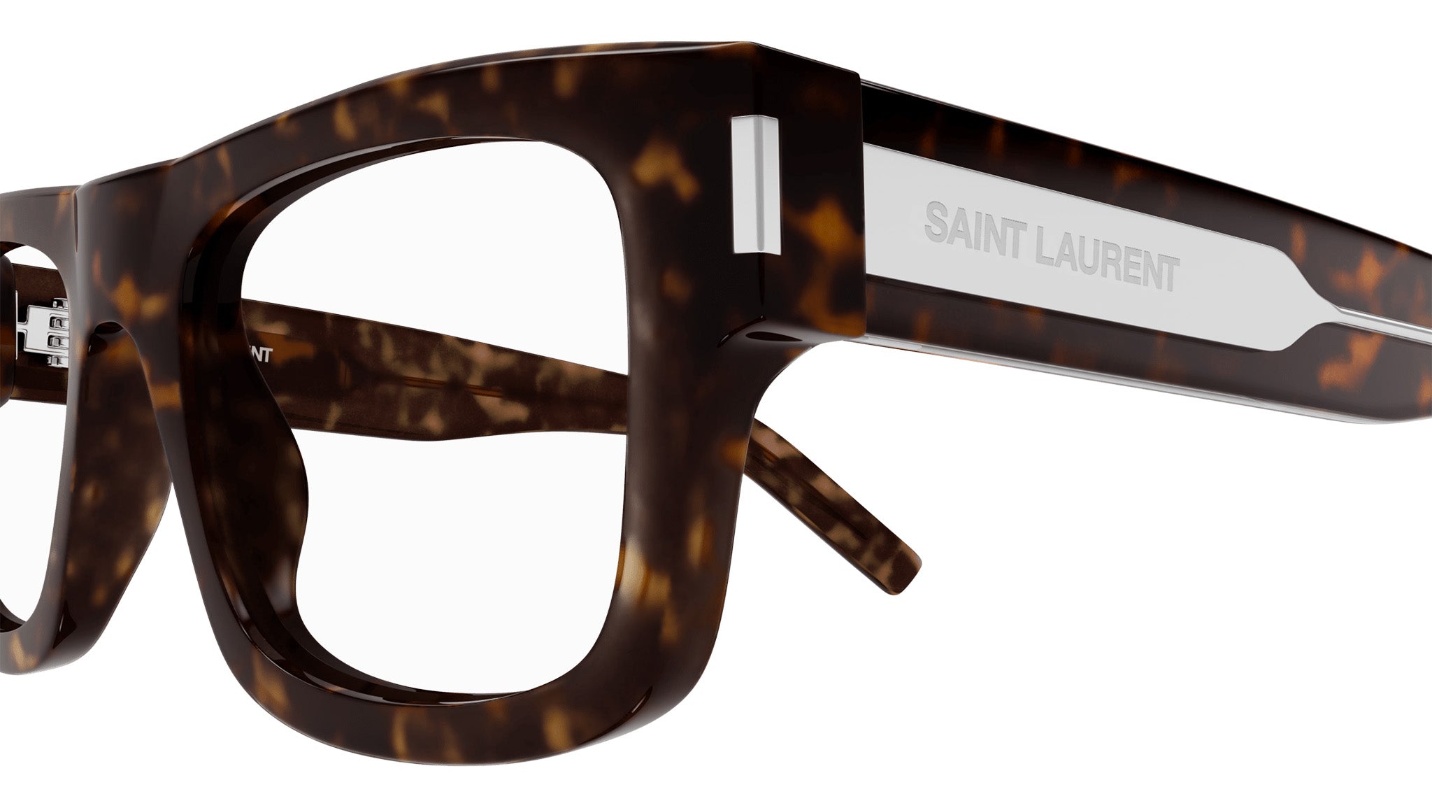 Occhiali da vista Saint Laurent linea Classic modello SL 574 variante colore 002 tartaruga scuro lucido con astine color cristallo trasparente.